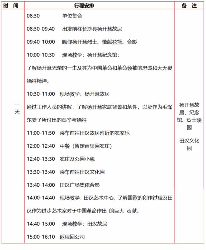 湖南晨曦红色教育给大家分享一份“不忘初心 砥砺前行”杨开慧纪念馆-田汉文化园一日主题党日活动方案!做为湖南红色教育培训一份不错的选择方案。![]() 二、红色基地介绍 1、田汉(1898-1968) 田汉,原名寿昌,生于湖南省长沙县,中国著名话剧作家、戏曲作家、小说家、诗人。田汉毕生从事文艺事业,他写的《义勇军进行曲》,被定为中华人民共和国国歌。他不仅是中国革命戏剧运动的奠基人和戏曲改革事业的先驱者,同时也是中国早期革命音乐、电影事业的卓越组织者和创造者。 ![]() 2、田汉文化园 田汉文化园是全国唯一一个完整展示田汉同志生平业绩和文学艺术成就的文化园区。位于长沙县果园镇,占地352亩,以田汉故居为核心,包括田汉艺术中心、田汉艺术学院、古戏楼、戏剧艺术街、国歌广场、戏剧雕塑园、月光湖、田汉文化美食街等11处景点。园区的建筑风格结合了湖湘文化特色,青砖灰瓦、泥巴色的墙面,并以麻石路贯穿整个园区。